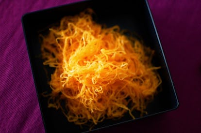 Фой тонг, что означает «золотистый шёлк» – это макароны из яичных желтков и сахарного сиропа. Готовить фой тонг – долгое и трудное занятие, символизирующее трудности семейной жизни, а само блюдо – символ вечной любви. На свадьбе важно следить за тем, чтобы самые длинные макаронины достались жениху и невесте (а если они фанаты «Леди и Бродяги», то явно захотят съесть одну и ту же с разных сторон).
